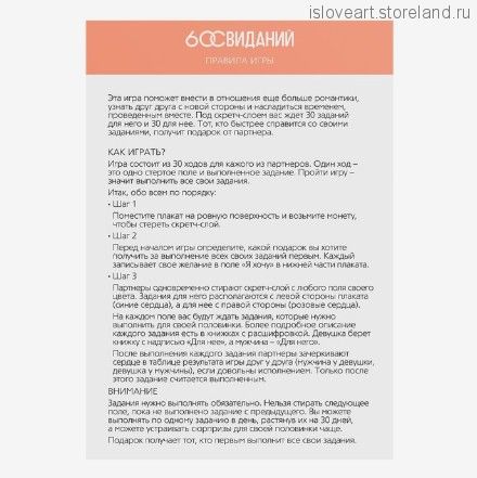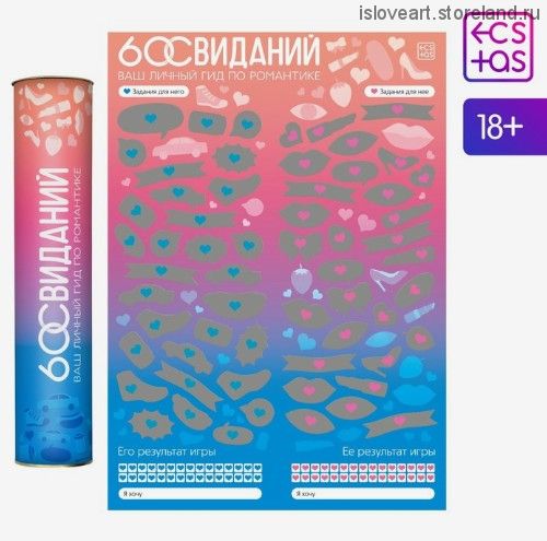 В этой игре вас ждут 60 романтических заданий для него и для неё, которые наполнят ваши отношения невероятными эмоциями и поднимут их на новый уровень. Стирайте скретч-слой, знакомьтесь с заданиями и выполняйте их. Тот из вас, кто быстрее с ними справится, получит приз. Какой именно? Узнаете в игре! Как пользоваться скретч-плакатом Для игры вам понадобится монетка, чтобы стереть скретч-слой. Партнёры одновременно стирают его с любой клетки плаката. Мужчина стирает клетки «Для него», а девушка — «Для неё». На каждой клетке есть романтические задания-свидания, которые вы должны организовать для своей половинки. Более подробное описание каждого свидания есть в книжках с расшифровкой. Задача партнёров — выполнять задания и радовать свою половинку. Игра интересна тем, что вы не выбираете, какое задание-свидание выполнить, они попадаются вам случайно. Но помните: вам нужно выполнить все 30 заданий раньше партнёра, ведь только так можно победить и получить приз! Внутри вы найдёте: скретч-плакат, 29,7 × 42 см, книжки с расшифровкой заданий для него и для неё, правила игры. Дарите друг другу любовь и наслаждение!